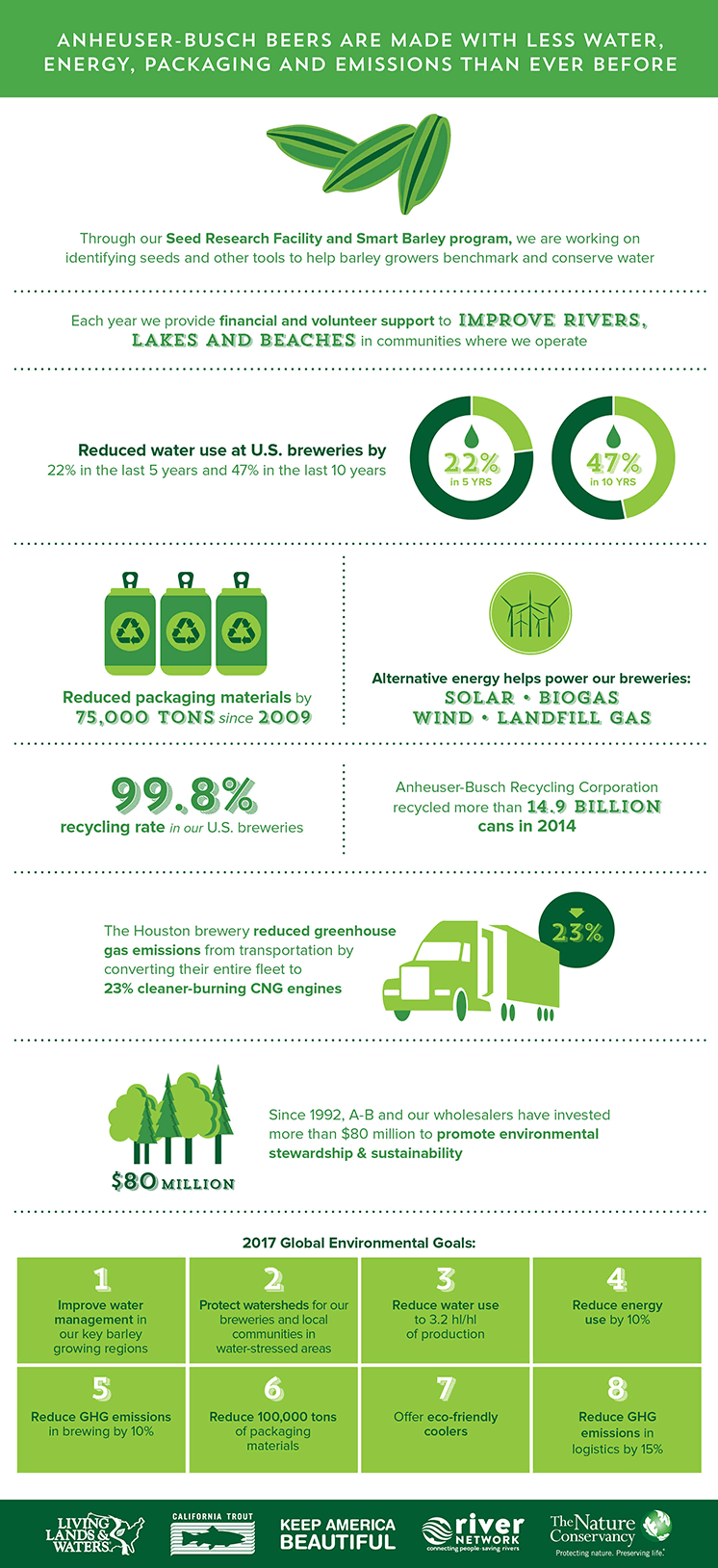 At Anheuser-Busch, we are committed to brewing the highest quality beers, improving our environmental performance, and making a positive impact on our communities. We focus our efforts both inside and outside our breweries on the key issues of water, energy, and recycling. We have made great progress and will continually strive to do more.